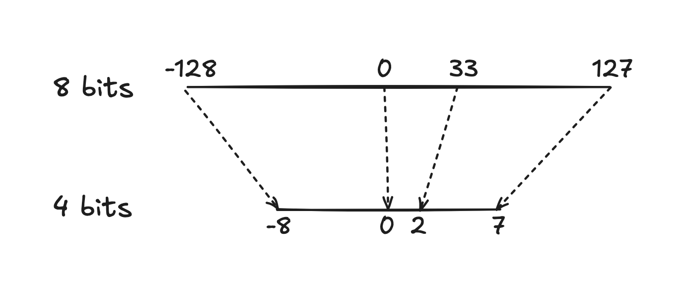 In 8-bit space, numbers range from -128 to 127, giving us 256 possible values. In 4-bit space, numbers range from -8 to 7, giving us only 16 possible values. To convert between them, we need a scale factor.