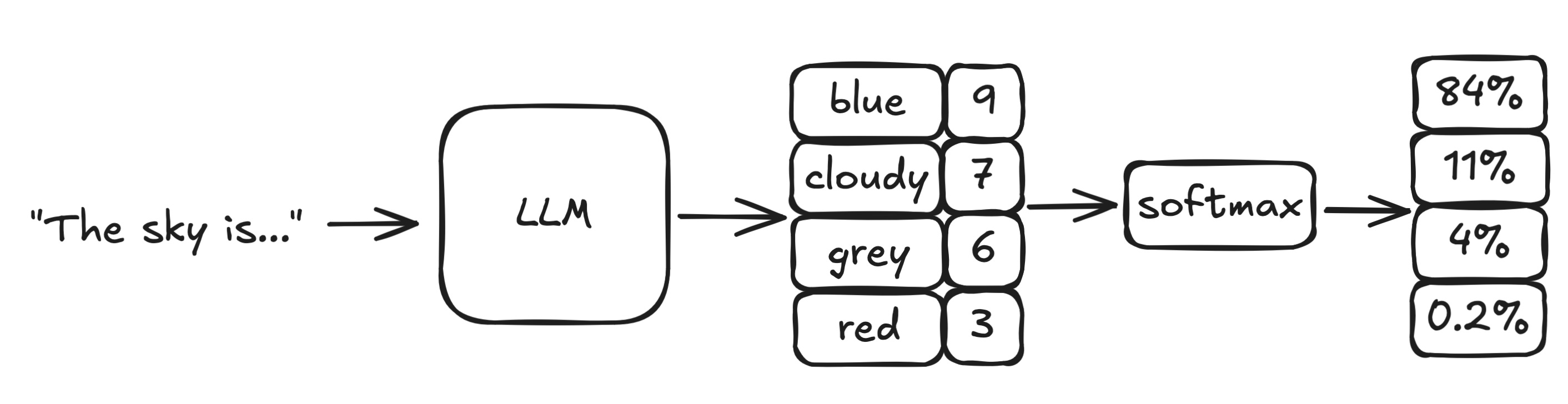 At each step, an LLM predicts a logit (number) for every possible next token.